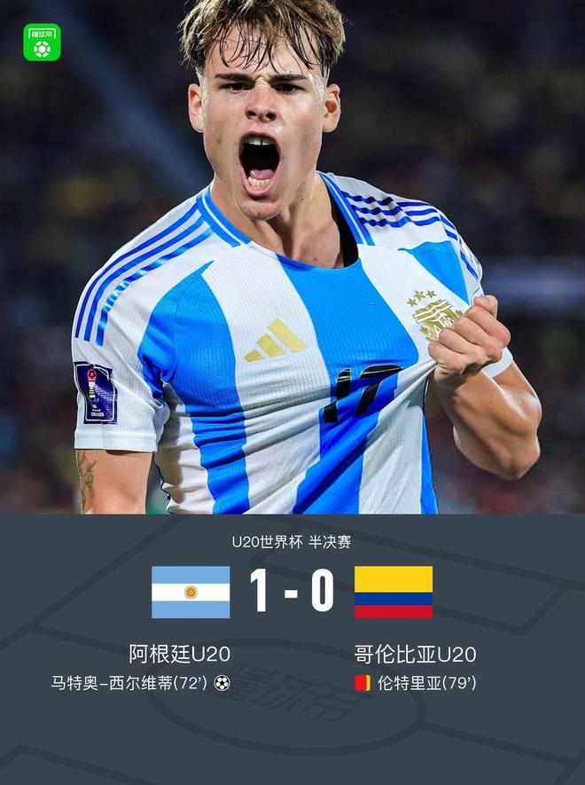 北京时间10月16日,U20世界杯半决赛中,哥伦比亚U20对阵阿根廷U20。比赛中,普雷斯蒂亚尼助攻马特奥·席尔维蒂捅射取胜,伦特里亚吃到两黄牌被罚下场。最终,阿根廷U20以1-0击败哥伦比亚U20,并在决赛中遭遇摩洛哥U20。主赛事第72分钟,普雷斯蒂亚尼突破对角传球助攻,马特奥·西尔维蒂射门破门,阿根廷U201-0打破僵局!第79分钟,伦特里亚战术犯规领到第二张黄牌,被罚下场。哥伦比亚U20球员缺一名球员,在激动人心的战斗时刻上场。第9分钟,战斗即将打响。奥斯卡·佩雷亚 (Oscar Perea) 传球,卡辛博 (Kasimbo) 点头被挡。第32分钟,卡辛博起球,米尔将球传给德尔加多。第35分钟,卡辛博因伤退场,第4分钟伦特里亚替补上场。 2 分钟内,胡安·阿利萨拉 br奥克远距离射门,球险些偏出。第52分钟,阿里斯蒂·扎瓦尔反击突入禁区,胡安·比利亚尔巴关键挡出。第55分钟,伦特里亚接球低射,桑蒂诺·巴尔比扑出。第77分钟,普雷斯蒂亚尼内切射门,但皮球被扑出。第85分钟,阿根廷U20前场断球,阿莱霍·萨尔科错失机会。