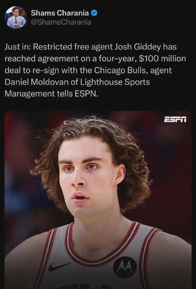 去海岸。吉迪(Gidey)和公牛队达成了一项为期四年,1亿美元的合同续签协议,如下:25-26季,2232万美元; 26-27期,241.1万美元; 27-28赛季,2589万美元; 28-29赛季,2768万美元。最后一天,吉迪(Gidey)和卡鲁索(Caruso)买了他们的老板。现在,一个人与公牛队赢得了1亿美元的合同,另一个赢得了雷霆队的职业生涯第二次冠军,并签署了为期四年,8110万美元的合同续签,这是完美的,而且是双赢的。库曼加(Kumangga)看到吉迪(Giddy)成功续签了他的合同,可能更加嫉妒,无法与勇士队妥协。根据湾区记者普尔(Poole)的说法,库玛加(Kumaga)预计将从勇士队获得790万美元的资格报价,这意味着该人有权在25-26期内进行否决权,而Maybecome则在明年夏天成为全面的自由球员。他的贸易价值无穷无尽,因此每个人都很难度过美好的时光。不值得在8月初,美国记者菲舍尔(Fischer)透露,勇士队已经联系了吉迪(Gidey)的团队,并表达了他们对他的兴趣。启示立即引起了激烈的讨论,许多人认为Gidi和他们的老板已经交换。现在,公牛队正式宣布了吉迪的合同续签,勇士队已经失去了出售库曼加的另一种方式...吉迪(Jidi)于2002年10月10日出生,即将23岁。他是第21轮中的第六顺位。他很高,高2.03米。自上个赛季与公牛队以来,他在职业生涯中发挥了最美好的时光。他场均得到14.6分,8.1个篮板,7.2个帮助和1.2个全面数据中断。他的三分命中率是46.5%,37.8%和78.1%,表明他在全明星赛上的地位。实际上,像基甸这样的球员很难经历,可能是下一个唐西奇。直到今天,公牛必须续签与他的合同,而外界有些令人惊讶。吉迪想要一个四年,1.2亿美元的续签合同,公牛在四年内支付了1亿美元。道路已经准备好了。将来,您应该表现出色,并努力充分实现自己的才华。在找到女朋友之前,您是否应该先看看您是否成年?